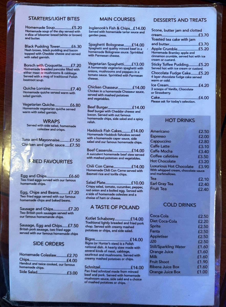 The heart of Inglenook lies in its welcoming atmosphere, praised by patrons for friendly service and a cozy setting—perfect for enjoying a substantial breakfast or a quick bite. Highlights include a hearty All-Day Breakfast at just £10.50, promising generous portions and satisfying flavors.